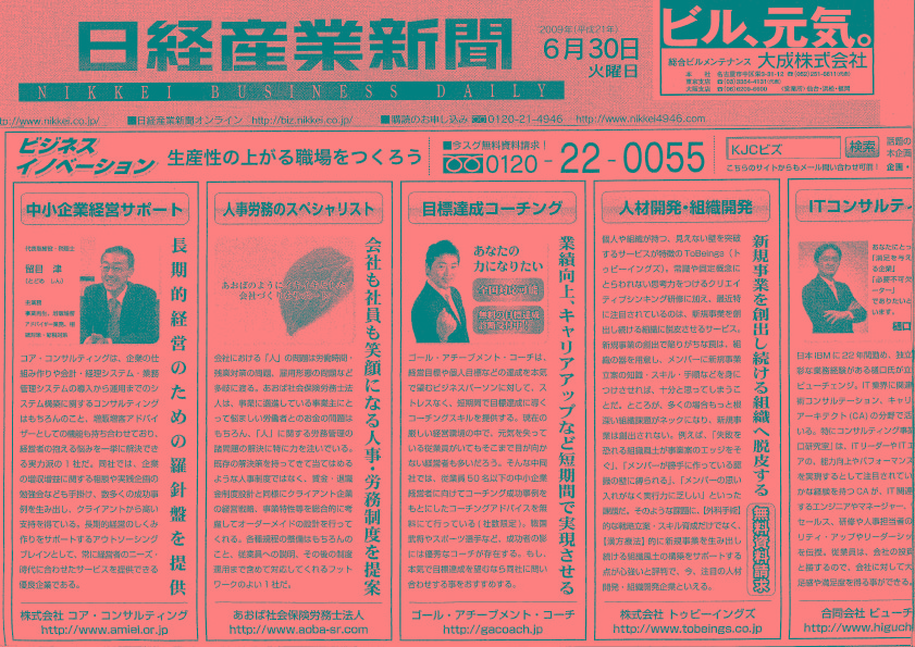 日経産業新聞 掲載記事! 2009年6月30日 お知らせ メディア掲載情報 2009年6月30日(火) 日経産業新聞の紙面において、中小企業の職場環境を改善し、生産性の上がる職場づくりをサポートする企業として、当社の特集が掲載されました。 中小企業の経営者は、資金繰りから営業や販売、人材育成、クレーム処理などなど、多忙を極めかゆいところまでは、なかなか手が届きません。そんな時に我々に声を掛けて頂ければ幸いです。 現状の問題点はどこか?どこが解決の糸口になるか? 見極めたうえで適切なサービスをご提供させて頂きます! セミナー 税のニュース CSRの取組 メディア掲載